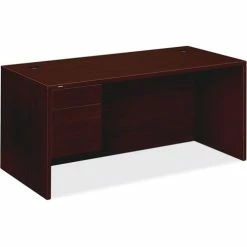 Hard-working, good-looking and built to survive a lifetime of overtime. Durable abrasion- and stain- resistant laminate. Drawers operate on ball bearing suspensions; file drawer extends fully and accommodates letter or legal size hanging files, box drawer extends three-quarters. HONยฎ “One Key” core removable locks make re-keying quick and easy. Full-height modesty panel for privacy. Two cord management grommets. Desk and Return sold and shipped separately–ORDER BOTH.