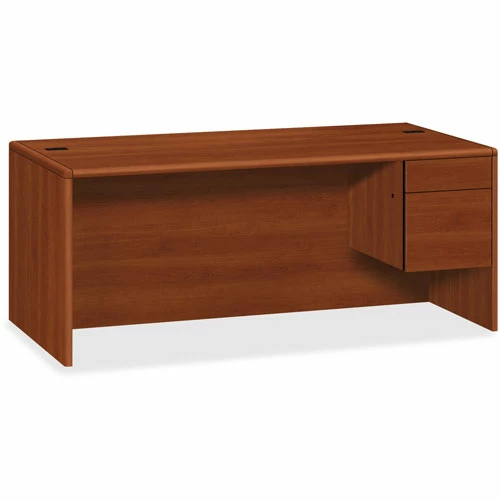 A modular management solution that combines stylish profiles and elegant accents with top-grade fit and finish. Abrasion- and stain-resistant high-pressure laminate with elegant hardwood trim. Drawers ride on steel ball bearing suspensions; file drawer extends fully and accommodates letter and legal size hanging files, box drawer extends three-quarters. HONยฎ โOne Key” core removable locks make re-keying quick and easy. Full-height modesty panel for privacy. Two worksurface grommets for cable management. Color: Cognac; Pedestal Count: 1; Top Shape: Rectangular; Top Material: High-Pressure Laminate.