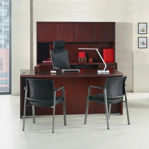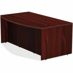 Bowfront desk is part of the Lorell Chateau Series that offers contemporary laminate office furniture with a durable design and multiple configuration options. The 1-1/2″ thick top features reeded edge detail for a distinct look. Design also includes a full modesty panel for privacy and high-quality, Mahogany laminate surface for durability. Two grommet holes in the top allow easy cord routing. Add Lorell Essentials Series pedestals (sold separately) to expand your storage options.