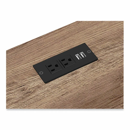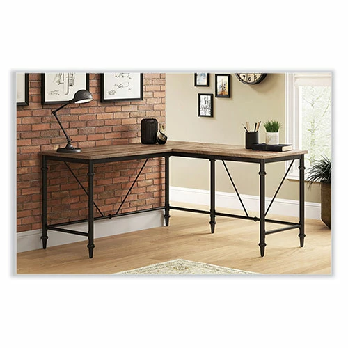 Breslyn L-shaped desk features a rustic, traditional design with a natural wood worksurface as well as a classic, powder-coated metal frame and matching legs. With space for two monitors, a keyboard, a mouse and other desktop necessities, this home-office solution provides ample space, so you can stay organized and productive. Antimicrobial protection along both work surfaces also helps you ensure a safe, healthful environment by minimizing the potential for bacteria growth. The desk’s included power center with two AC outlets and two USB ports along with two cord management grommets conveniently keeps you powered up while keeping your desktop neat and tidy. Assembly required.
