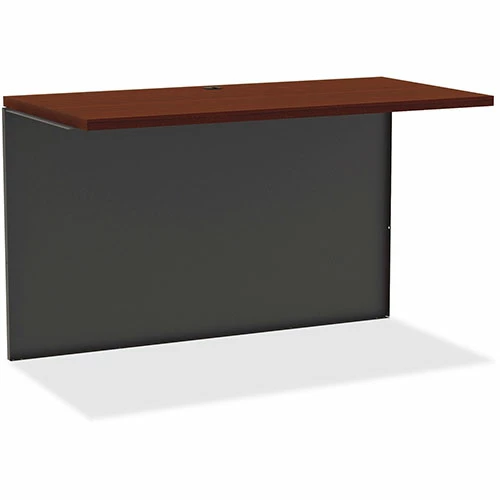 Bridge is part of the Lorell Commercial Steel Desk Series with commercial-quality performance and components. Durable steel chassis supports a 1-1/8″ thick, laminated top with two integrated grommets for wire management. Laminate is stain-resistant and scratch-resistant for durability. This 48″ wide bridge can be combined with single-pedestal desk or single-pedestal credenza to create a U-station. Mount on the side with no pedestal to avoid interference. Bridge should not be used freestanding. Built-in cord management provides easy access to power and data while minimizing clutter. Rich mahogany laminate and charcoal paint create an upscale look and feel for any application.
