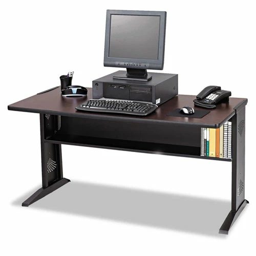 Melamine top reverses during setup for a choice of mahogany or medium oak finish. Black steel base with full-width 6 3/4″ deep storage shelf. 12″ modesty panel for privacy. Cable routing cutouts for installation along a wall.