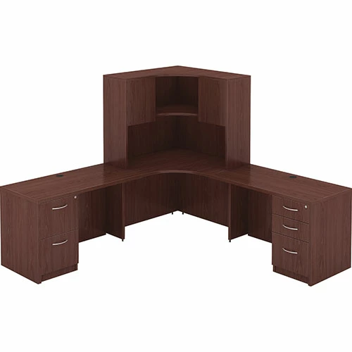 Corner desk is part of Lorell Essentials Series Laminate Furniture with high-quality laminate construction and metal-to-metal, cam-lock connections. Mahogany laminate top is 1″ thick for durability. Use the grommet hole in the top for easy cord routing. Design also includes a full modesty panel for privacy, 3mm PVC edges and adjustable feet.