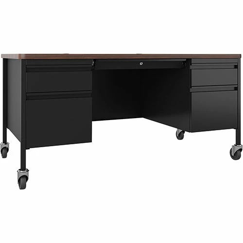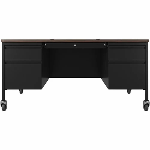 Mobile double-pedestal desk belongs to the Lorell Fortress Series Teachers Desks that offer a practical and professional desk solution ideal for educational offices and classrooms. Durable, high-quality steel construction in black withstands rigorous daily use. The durable top features a T-mold edge to promote safety and high-performance, Classic Walnut laminate surface that is scratch-resistant, stain-resistant and water-resistant. Mobile desk is also equipped a 3/4 modesty panel, locking center drawer and two box/file pedestals with full-extension, ball-bearing slides. Integrated drawer pulls are full-width. Central lock system locks all drawers. Desk also features two locking casters and two nonlocking casters. Steel construction and laminate top make the desk easy to clean and disinfect. Reinforced, double-frame inner structure keeps desk solid and sturdy for years of use. Steel desking meets or exceeds ANSI/BIFMA standards.
