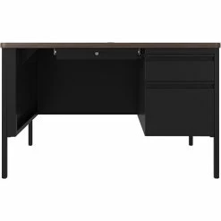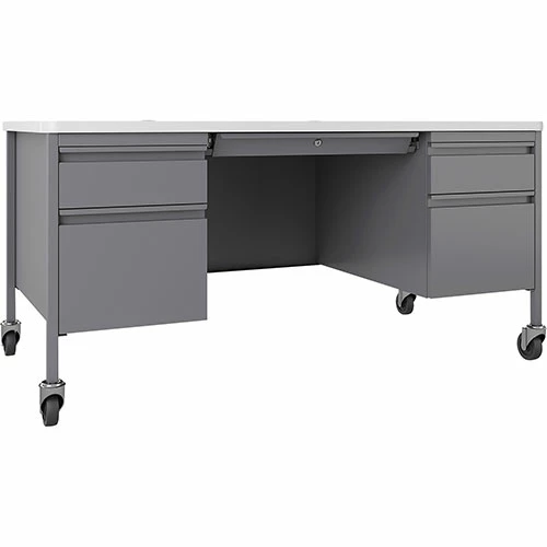 Mobile double-pedestal desk belongs to the Lorell Fortress Series Teachers Desks that offer a practical and professional desk solution ideal for educational offices and classrooms. Durable, high-quality steel construction in platinum withstands rigorous daily use. The durable top features a T-mold edge to promote safety and high-performance, white laminate surface that is scratch-resistant, stain-resistant and water-resistant. Mobile desk is also equipped a 3/4 modesty panel, locking center drawer and two box/file pedestals with full-extension, ball-bearing slides. Integrated drawer pulls are full-width. Central lock system locks all drawers. Desk also features two locking casters and two nonlocking casters for easy mobility. Steel construction and laminate top make the desk easy to clean and disinfect. Reinforced, double-frame inner structure keeps desk solid and sturdy for years of use. Steel desking meets or exceeds ANSI/BIFMA standards.