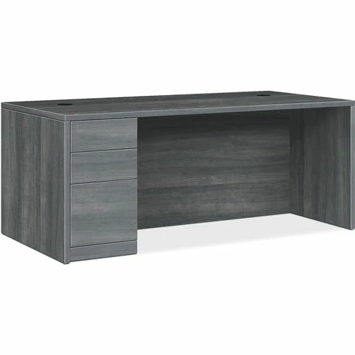 Left-pedestal desk belongs to the HON 10500 Series Wood Laminate Furniture, a versatile collection for any office arrangement. Smooth, flat edges and a full modesty panel deliver a clean, streamlined look. Scratch-resistant, spill-resistant and wear-resistant, Sterling Ash laminate on strong inner-frame construction assures trouble-free performance and long life. Desk features one pedestal on the left side with two box drawers for supplies and one file drawer for filing. All drawers feature five-sided construction for added strength and easy alignment or replacement of drawer fronts. Drawers operate on full-extension, ball-bearing suspension. File drawer includes integrated hangrails for side-to-side letter-size or legal-size filing and front-to-back letter-size filing. Desk also has a rectangular top, two 3″ round grommets to route and hide wires and cables, and interchangeable, core-removable lock for quick, easy rekeying. Center drawer for the desk is sold separately.