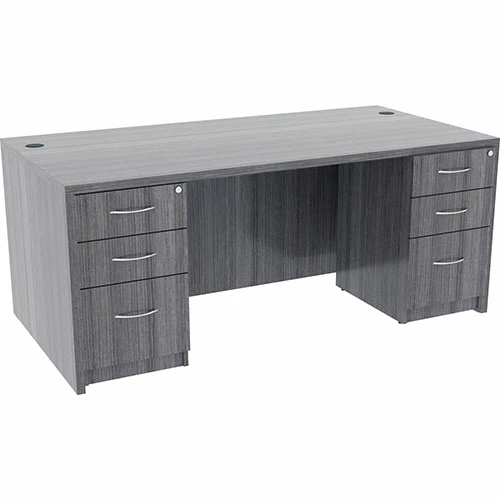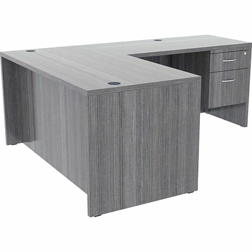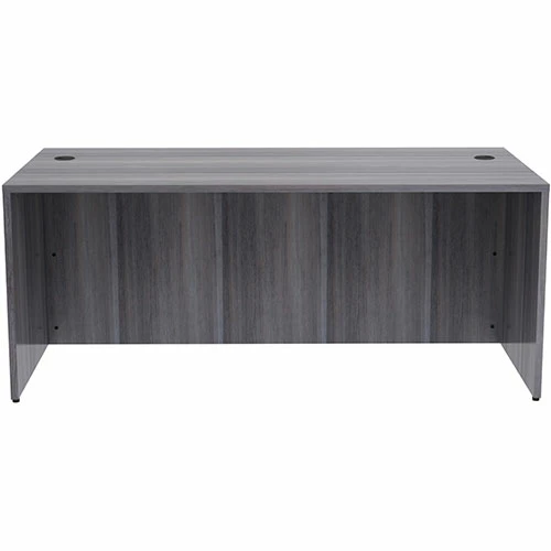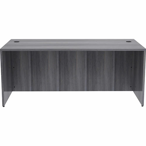 Rectangular desk shell is part of Lorell Essentials Series Laminate Furniture with high-quality laminate construction and metal-to-metal, cam-lock connections. Weathered charcoal laminate top is 1″ thick for durability. Desk can be used in L-shaped configurations. Use the two grommet holes in the top for easy cord routing. Design also includes a full modesty panel for privacy, 3mm PVC edges and adjustable floor guides for stabilization. Furniture has pre-drilled holes with metal inserts for easy attachment.