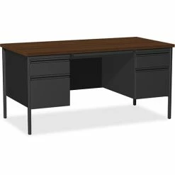 Double-pedestal desk is part of the Lorell Fortress Series, a practical and professional desk solution ideal for business, government and educational offices. Durable, high-performance steel construction stands up to rigorous daily use. The 1-1/8″ thick top with square edges features a Walnut laminate surface that is scratch-resistant, stain-resistant and water-resistant. Design also features a 3/4-height modesty panel and box/file pedestal on both sides. Drawers lock and offer full-extension, ball-bearing slides and full-width, integrated drawer pulls. File drawers accommodate letter-size files. Central-locking center drawer features a core-removable lock. Two grommets offer easy cord management. Reinforced, double-frame inner structure keeps desk solid and sturdy for years of use. Steel construction and laminate top make the desk easy to clean and disinfect. Steel desk in black meets or exceeds ANSI/BIFMA standards.