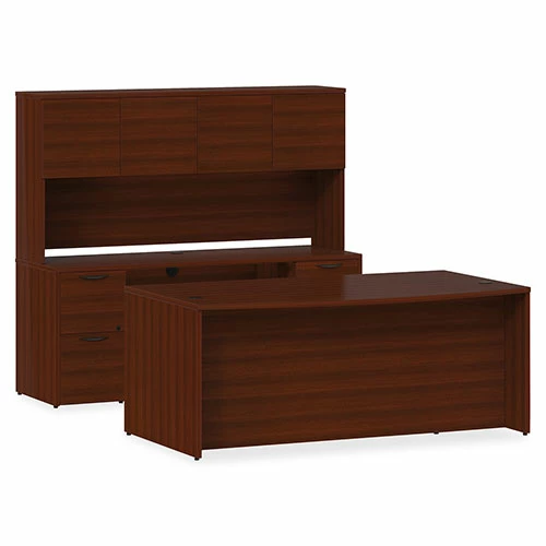 Double-pedestal desk is part of the elegant, Lorell Prominence 2.0 Series that is perfect for your executive office suites. Durable, Mahogany laminate surface is mar-resistant, burn-resistant and impact-resistant to withstand daily work life. The 1″ thick top with matching 3mm edgebanding is made with 45 lb. density particleboard and finished on both sides with high-performance, thermally fused melamine. 60″ wide desk features a full modesty panel, two grommets in the top for cord management and two 3/4 pedestals with locking drawers to secure files and supplies. One pedestal includes two file drawers while the other pedestal includes two box drawers for supplies and one more file drawer for additional file space. File drawers hold letter-size or legal-size hanging files. Box and file drawers have 100 lb. full-suspension, ball-bearing slides. The 3/4″ adjustable glides allow desk to remain level on uneven surfaces. Desk ships fully assembled so it’s ready for immediate use.