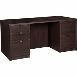 Double-pedestal desk is part of the Lorell Prominence 2.0 Series that is perfect for your executive offices. Durable, Espresso laminate surface is mar-resistant, burn-resistant and impact-resistant to withstand daily work life. The 1″ thick top with matching 3mm edgebanding is made with 45 lb. density particleboard and finished on both sides with high-performance, thermally fused melamine. 66″ wide desk features a full modesty panel for privacy, two grommets in the top, and two 3/4 pedestals with locking drawers to secure files and supplies. One pedestal includes two file drawers while the other pedestal includes two box drawers for supplies and one more file drawer for additional file space. File drawers hold letter-size or legal-size hanging files with included hangrails. Box and file drawers have 100 lb. full-suspension, ball-bearing slides. The 3/4″ adjustable glides allow desk to remain level on uneven surfaces. Desk ships fully assembled so it’s ready for immediate use.