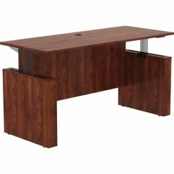 Sit-to-Stand Desk Shell is part of Lorell Essentials Series Laminate Furniture with high-quality laminate construction and metal-to-metal, cam-lock connections. Cherry laminate top with 3mm PVC edges is 1″ thick for durability and features a grommet for easy cord management. Set includes a full modesty panel for privacy and leg panels with adjustable feet. With a height range of 27-1/2″ to 47″ , the Lorell Sit-to-Stand Electric Adjustable Bar (sold separately) raises the desk from 29″ to 49″ high.