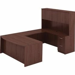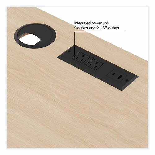 Furnish your home office and power your devices while you keep all of your supplies and materials within easy reach. The Essentials Single-Pedestal Writing Desk with Integrated Power Management provides all of the conveniences of an at-the-office desk in a format that’s designed to fit seamlessly into your home. A single, three-drawer pedestal delivers the familiar box, box, locking-file format needed for your everyday office essentials and frequently referenced files. An ultra-durable, all-metal A-frame base provides sturdy support, while six leveling glides help you ensure stable positioning. Integrated power management system features two AC outlets, two USB ports and a secondary cable-management grommet placed conveniently on the worksurface as well as a hidden cable management channel that allows you to keep all of your unsightly cables neatly tucked away and off the floor. Simply plug your desk into the nearest AC outlet, and you’ll have the power you need to stay productive. Durable worksurface and matching pedestal feature wood-laminate construction with a realistic woodgrain finish for a clean, stylish look. Assembly required.