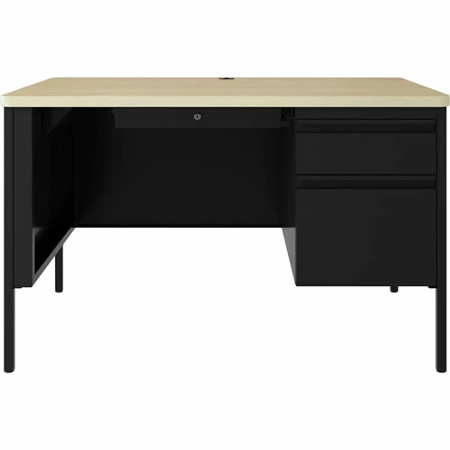 Single-pedestal desk belongs to the Lorell Fortress Series Teachers Desks that offer a practical and professional desk solution ideal for educational offices and classrooms. Durable, high-quality steel construction in black withstands rigorous daily use. The durable top features a T-mold edge to promote safety and high-performance, Maple laminate surface that is scratch-resistant, stain-resistant and water-resistant. Desk is also equipped a 3/4 modesty panel, locking center drawer and box/file pedestal on the right with full-extension, ball-bearing slides. Integrated drawer pulls are full-width. Central lock system locks all drawers. Steel construction and laminate top make the desk easy to clean and disinfect. Reinforced, double-frame inner structure keeps desk solid and sturdy for years of use. Steel desking meets or exceeds ANSI/BIFMA standards.