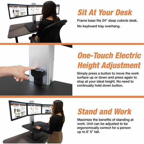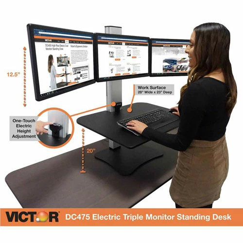High Rise Electric Triple Monitor Standing Desk transforms any sit-down desk or table into a sitting or standing desk. It supports three monitors up to 23″ wide and up to 12.5 lb. each. The 28″ wide x 23″ deep surface can be raised up to 20″ above your desktop for ergonomic placement of monitor, keyboard and mouse while standing. Electric motor allows easy custom height adjustment with the push of a button. Easy Tap Technology makes operation quick and simple. Triple-monitor holder also adjusts in height with a range of 12-1/2″. The DC475 worksurface and monitor holders can be raised to the correct ergonomic height for users up to 6’5″. Safety Sensor stops movement when obstacles are detected under the desk. Sleek wood construction and a durable laminate coating provide years of use. Sturdy steel base and aluminum tower are built to last. Steel base has felt pads underneath to protect desktop surface. With no clamping or attachments of any kind, the workstation is easily repositioned.