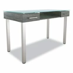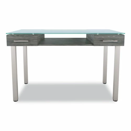 Combine sophistication and functionality when you add this desk to your office. Gleaming glass desktop delivers a modern look and a smooth writing surface. Two letter-size drawers provide discreet storage for office supplies and paperwork. Open design underneath provides space for additional desk components to create a custom setup. Features metal legs for added strength and stability.