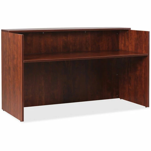 Front reception desk promotes work efficiency while projecting a professional image for greeting visitors. It is part of the Lorell Essentials Series Wood Laminate Furniture with high-quality laminate construction and a contemporary design. High sides surround the desktop on three sides and extend to the floor to provide privacy for confidential documents and details. The built-in counter above the desktop acts as writing support and platform for connecting with customers or patients. Desktop and counter feature 1″ thick laminated tops for durability.