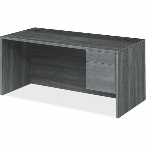Right-pedestal desk is part of HON 10500 Series Wood Laminate Desking that offers practical functionality and uncompromising durability. Durable, 1-1/8″ solid-core, high-performance particleboard resists warping. Laminate is scratch-resistant, stain-resistant and spill-resistant. Single-pedestal desk features a full-height modesty panel and 3/4 pedestal with one box and one file drawer. Drawers lock and offer five-sided construction for easy drawer alignment or replacement of drawer fronts. Interchangeable core-removable lock makes rekeying quick and easy. Box drawers operate on ball-bearing suspension with 3/4 extension while the file drawers extend fully on ball-bearing suspension. Built-in hangrails are designed for side-to-side, letter-size or legal-size filing and front-to-back letter-size filing. Two round grommets (3″) in the desktop offer easy cord management.