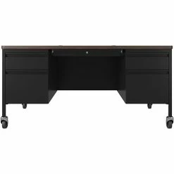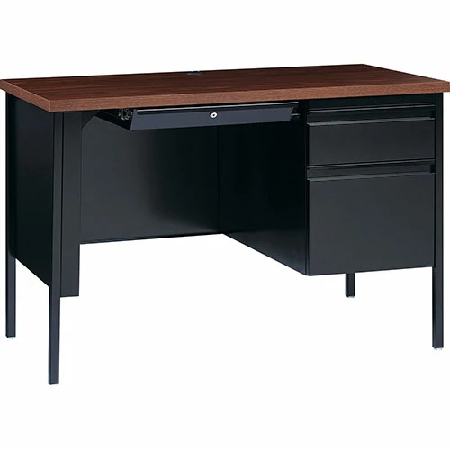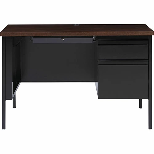 45-1/2″ wide single-pedestal desk is part of the Lorell Fortress Series, a practical and professional desk solution ideal for business, government and educational offices. Use this right-pedestal desk with a Fortress left return for L-shaped configurations. Both have 3/4-height modesty panels for seamless lines. Durable, high-performance steel construction stands up to rigorous daily use. The 1-1/8″ thick top with square edges features a Walnut laminate surface that is scratch-resistant, stain-resistant and water-resistant. Design also features a box/file pedestal on the right. Both drawers lock and offer full-extension, ball-bearing slides and full-width, integrated drawer pulls. File drawer accommodates letter-size files. Central-locking center drawer features a core-removable lock. Center grommet allows easy cord management. Reinforced, double-frame inner structure keeps desk solid and sturdy for years of use. Steel desk in black meets or exceeds ANSI/BIFMA standards.