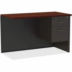 Right return is part of the Lorell Commercial Steel Desk Series with commercial-quality performance and components. Durable steel chassis supports a 1-1/8″ thick, laminated top. Laminate is stain-resistant and scratch-resistant for durability. This 48″ wide right return can be combined with a left desk or left credenza to create an L-workstation. This unit is not intended to be freestanding. The single pedestal on the return includes one box drawer for supplies and one file drawer for hanging file folders. Both lock. Steel ball-bearing suspension makes drawers easy to operate. Built-in cord management provides easy access to power and data while minimizing clutter. Rich mahogany laminate and charcoal paint create an upscale look and feel for any application. Superior steel construction withstands heavy activity and relocation.