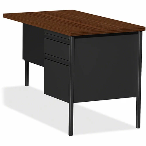 Right-pedestal return is part of the Lorell Fortress Series, a practical and professional desk solution ideal for business, government and educational offices. Use this right-pedestal return with a Fortress left-pedestal desk for L-shaped configurations. Both have 3/4-height modesty panels for seamless lines. Durable, high-performance steel construction stands up to rigorous daily use. The 1-1/8″ thick top with square edges features a Walnut laminate surface that is scratch-resistant, stain-resistant and water-resistant. Design also features a box/file pedestal on the right. Both drawers offer full-extension, ball-bearing slides and full-width, integrated drawer pulls. File drawer accommodates letter-size files. Center grommet allows easy cord management. Reinforced, double-frame inner structure keeps desk solid and sturdy for years of use. Steel return in black meets or exceeds ANSI/BIFMA standards.