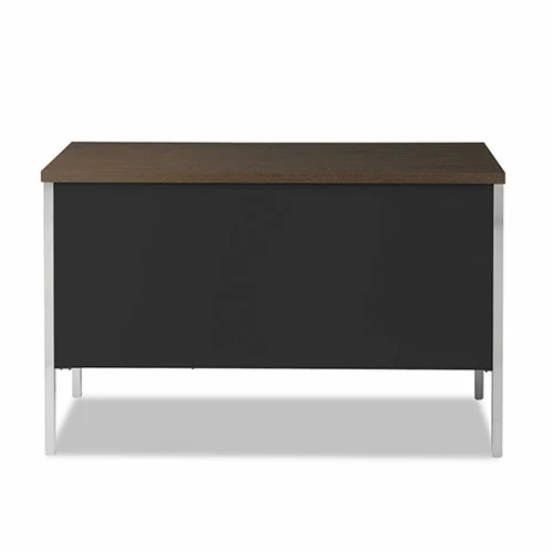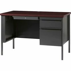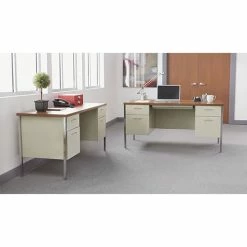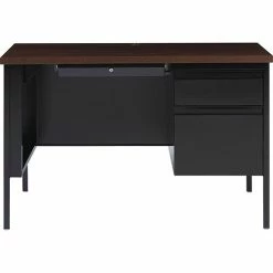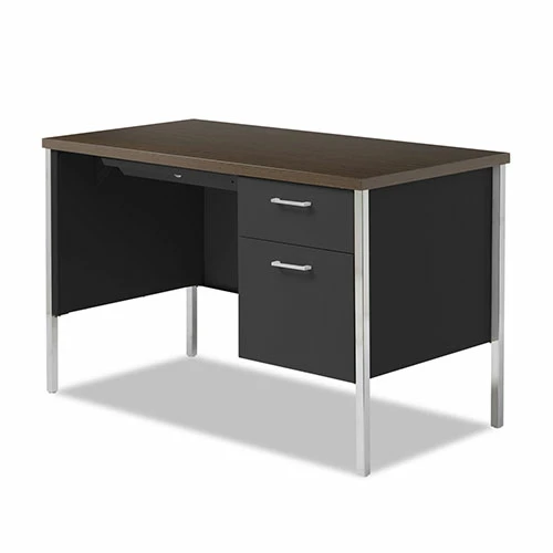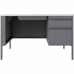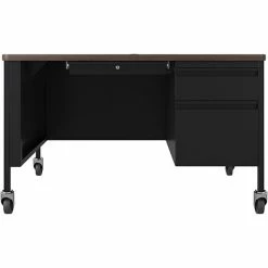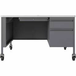 Durable square edge laminated top is scratch- and stain-resistant. Powder coated steel frame with chrome-plated 1″ square tubular steel legs. Full-extension locking file drawer with telescoping ball bearing slides accommodates hanging file folders. Box drawer with dividers operates on steel roller suspensions. Center drawer lock secures all drawers. Aluminum drawer handles. Three-quarter height modesty panel provides privacy. Leveling glides adjust for uneven floors.