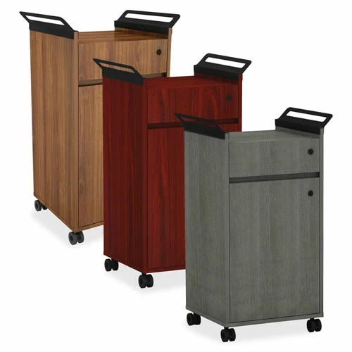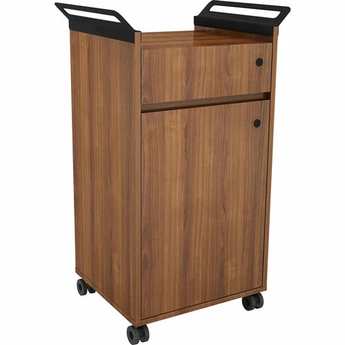 Small mobile storage cabinet with a drawer provides convenient, extra storage that blends with your Walnut decor. Every side and top are laminated to match your other laminate office furniture. Convenient steel handles are contoured and angled for an easy grip. Behind the single door, the cabinet offers ample storage space that includes a shelf. It moves easily on four casters.