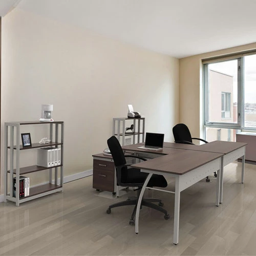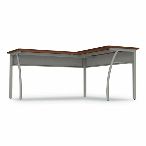 Stylish minimalist design for universal appeal. Scratch- and stain-resistant woodgrain laminate with durable edge and strong powder coated steel frame. Configures right or left to suit your needs. Adjustable leveling glides for stability. Quick and easy assembly in minutes with no tools required.
