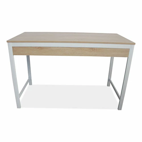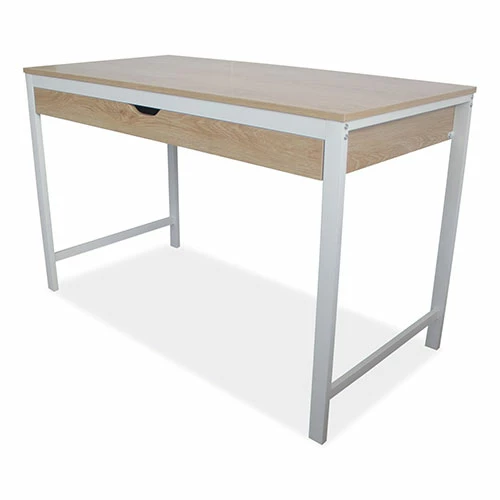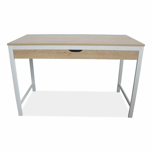 Modern writing desk with large drawer for storage is ideal for working or studying. Constructed with a smooth, laminate wood top with durable, steel legs. The wide work surface is ideal for managing multiple tasks at once. The simplistic, multi-function design can be used as a desk or console table. The open design has a light, airy feel, and coordinates with most spaces. Finished on all sides for position flexibility. Some assembly is required.